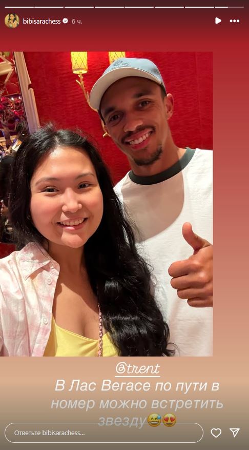 В своих Instagram-stories Бибисара опубликовала фотографию с футболистом " Реал Мадрид " Трентом Александер-Арнольдом. На снимке Асаубаева улыбается рядом с футболистом.