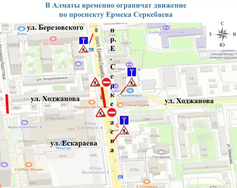 Движение для автотранспорта по проспекту Ермека Серкебаева в Бостандыкском районе Алматы будет закрыто от улицы Березовского до улицы Ескараева в обоих направлениях с 6.00 10 августа (суббота) до 10.00 13 августа (вторник), сообщает Zakon.kz.
