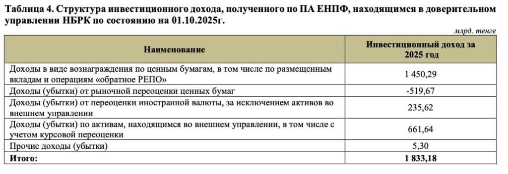 Национальный банк получил в январе-сентябре 2025 года 1,83 трлн тенге инвестиционного дохода на пенсионных активах ЕНПФ, находящихся в его доверительном управлении, сообщается в отчете.