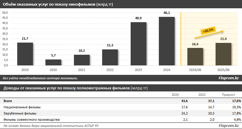 Статистика оказанных услуг по показу кинофильмов говорит о том, что кинотеатры только наращивают объёмы. Согласно данным БНС, за первое полугодие 2025-го объём услуг в секторе составил 21,4 млрд тг — на 30,5% больше, чем за аналогичный период прошлого года. Впрочем, постепенный рост объёма услуг по показу кинофильмов наблюдается каждый год после катастрофического для отрасли 2020-го.