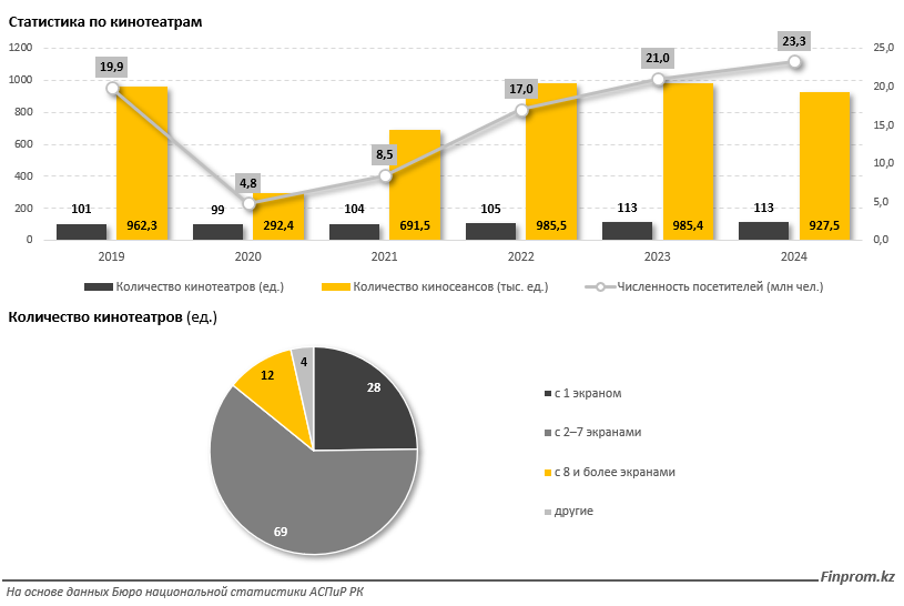 В прошлом году в Казахстане работали 113 кинотеатров — столько же, сколько и в 2023-м. Три четверти из них (81) составили кинотеатры с несколькими экранами, четверть (28) — кинотеатры с одним экраном.