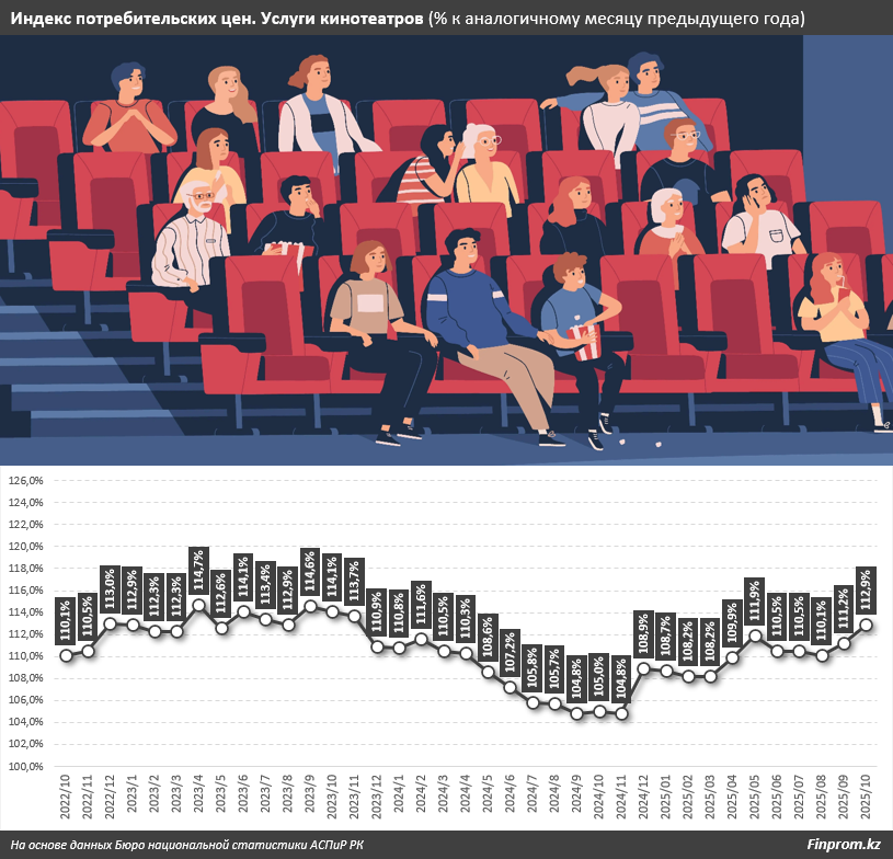 Накануне зимнего сезона в казахстанских кинотеатрах всё быстрее растут цены на билеты. По данным Бюро национальной статистики (БНС) АСПиР РК, в октябре 2025-го стоимость разового посещения кинозала подорожала на 12,9% за год. Ускорение роста цен наблюдается с начала осени. Впрочем, судя по многолетней динамике, ситуация повторяется второй год подряд. Наибольшие индексы потребительских цен на услуги кинотеатров отмечаются именно накануне холодного сезона, когда люди чаще ходят в кино — в октябре, ноябре или декабре.