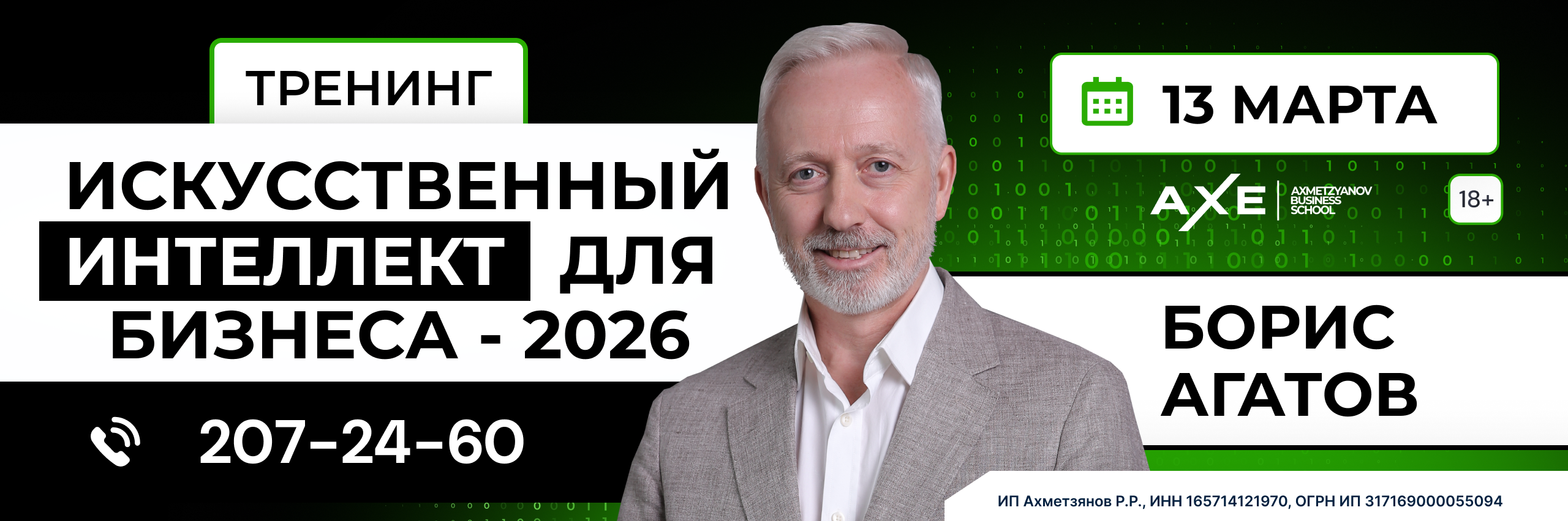 Уже завтра, 13 марта, в Казани пройдёт практический тренинг эксперта по инновациям Бориса Агатова «Искусственный интеллект для бизнеса». Остался один день, чтобы купить билеты на однодневный тренинг, где предприниматели получат готовые инструменты для внедрения нейросетей в свои процессы без разработки дорогостоящих IT-решений. Зарегистрироваться можно на официальном сайте.