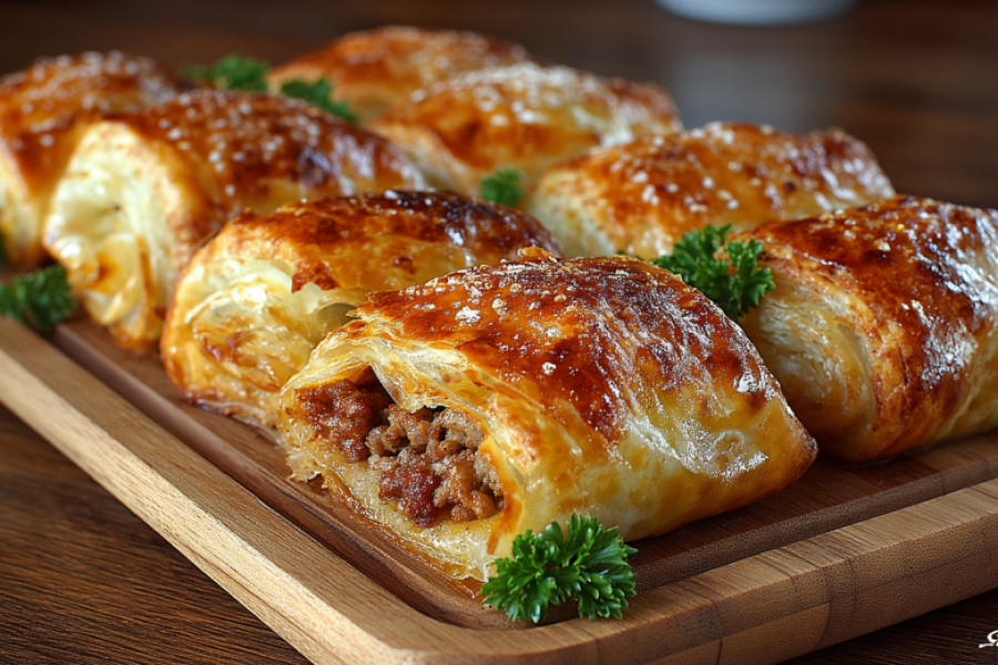 Это гениально простое и невероятно вкусное блюдо, идеальное для ужина или перекуса. Получается обалденная вкуснятина: золотистое слоистое тесто с хрустящей корочкой, а внутри — сочная мясная начинка с луком и специями, которая делает каждый кусочек ароматным и тающим во рту.