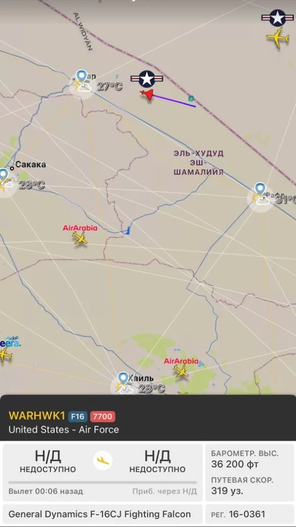 Самый тревожный сигнал поступил от истребителя F-16. Борт над Саудовской Аравией подал сигнал бедствия, после чего намеренно отключил идентификационный маяк. Эксперты опознали в нём F-16CJ из эскадрильи Wild Weasels («Дикие ласки»).