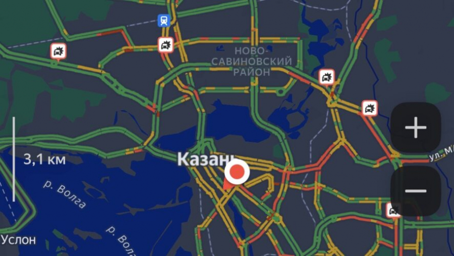Согласно данным сервиса, особенно сильно движение затруднено в центре города. В Вахитовском районе Казани все улицы окрашены в желтый и красный. Подобная ситуация происходит в Советском, Приволжском и Ново-Савиновском районах.