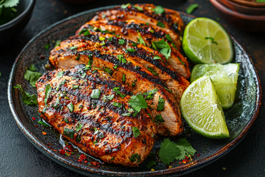 Начинаю с приготовления маринада: из лайма выжимаю сок, чеснок очищаю и пропускаю через пресс или мелко рублю. В подходящей по размеру миске смешиваю сок лайма, чеснок, зернистую горчицу, все специи (паприку, чили, орегано) и оливковое масло. Добавляю соль и перец по вкусу. Стейки индейки промываю, обсушиваю бумажным полотенцем и слегка отбиваю через пищевую плёнку для равномерной толщины. Погружаю мясо в маринад. Накрываю миску пищевой плёнкой и оставляю на 30-60 минут (если время позволяет, можно убрать в холодильник на 2-3 часа). Разогреваю сковороду-гриль или обычную сковороду с толстым дном на сильном огне. Выкладываю стейки и обжариваю по 4-5 минут с каждой стороны до появления аппетитной корочки. Важно не пересушить мясо — индейка готовится быстро. Даю мясу отдохнуть 2-3 минуты перед подачей. Подаю с овощным салатом, рисом басмати или завернув в тортильи с гуакамоле.