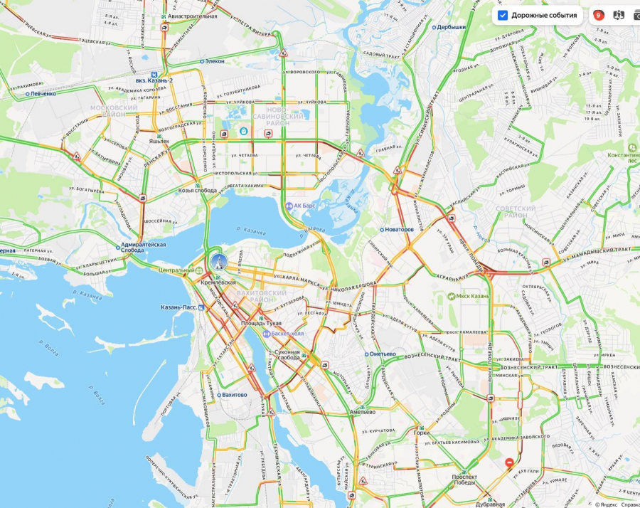 Сегодня вечером, в час-пик Казань встала в 9-балльных пробках, движению мешают суженные от неубранного снега дороги и несколько ДТП.
