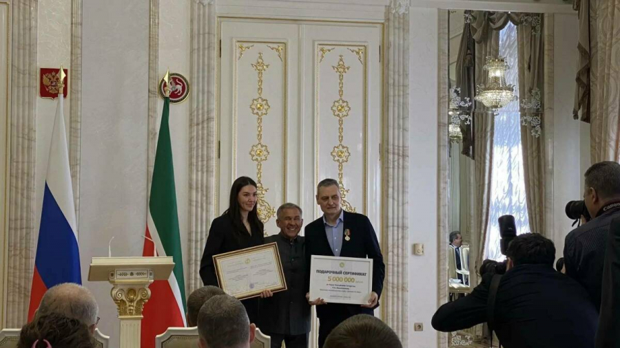 Сегодня в здании Казанского Кремля состоялось чествование женской волейбольной команды Казани – «Динамо-Ак Барс». Раис РТ Рустам Минниханов поздравил казанских девушек с завоевание восьмого титула и победой в чемпионате России в сезоне-2025/26. Глава республики вручил спортсменкам государственные награды и подарки, а также памятную благодарность клубу и сертификат на 5 млн. рублей.